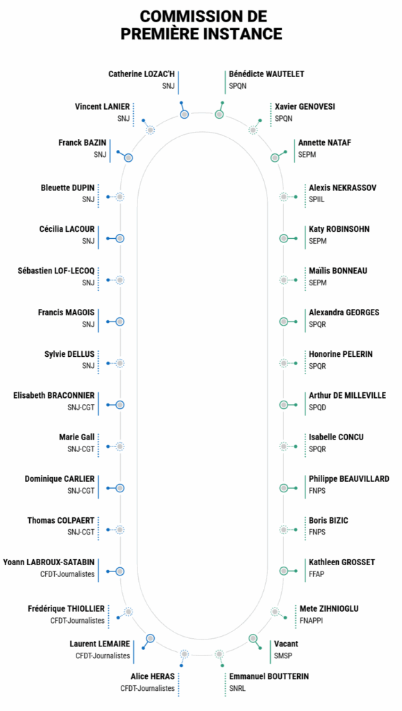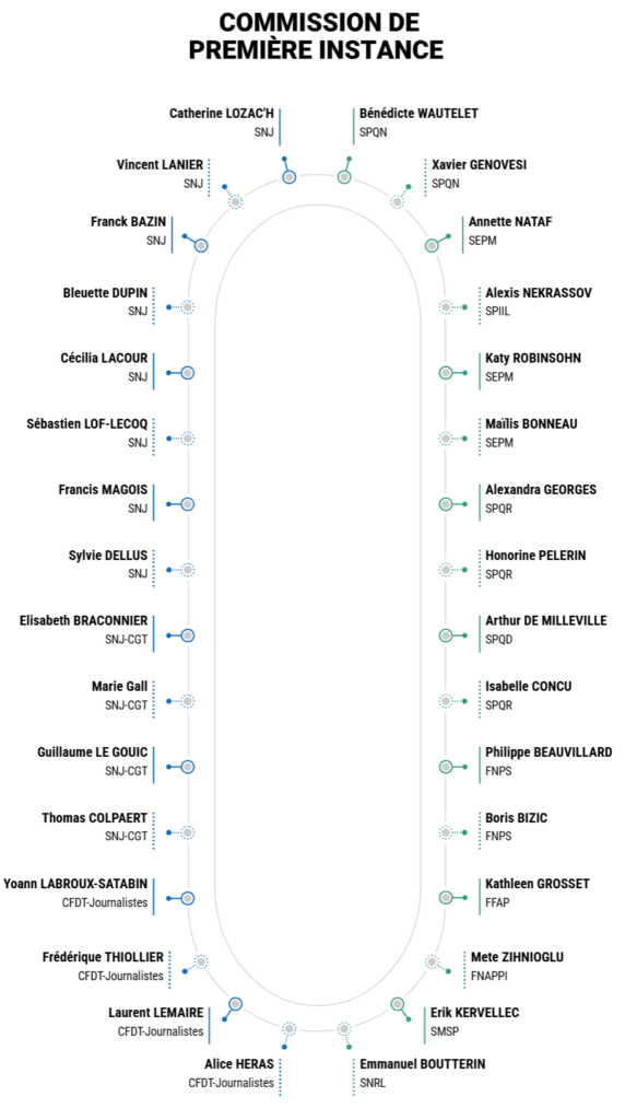 Les seize représentants titulaires et suppléants des journalistes, élus par les journalistes eux-mêmes, sont issus du SNJ, du SNJ-CGT et de la CFDT.